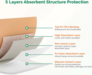 - Soft, comfortable & high absorbent foam pad, lock the wound exudate, reduce skin maceration risk, provide cushion and redistribute pressure.